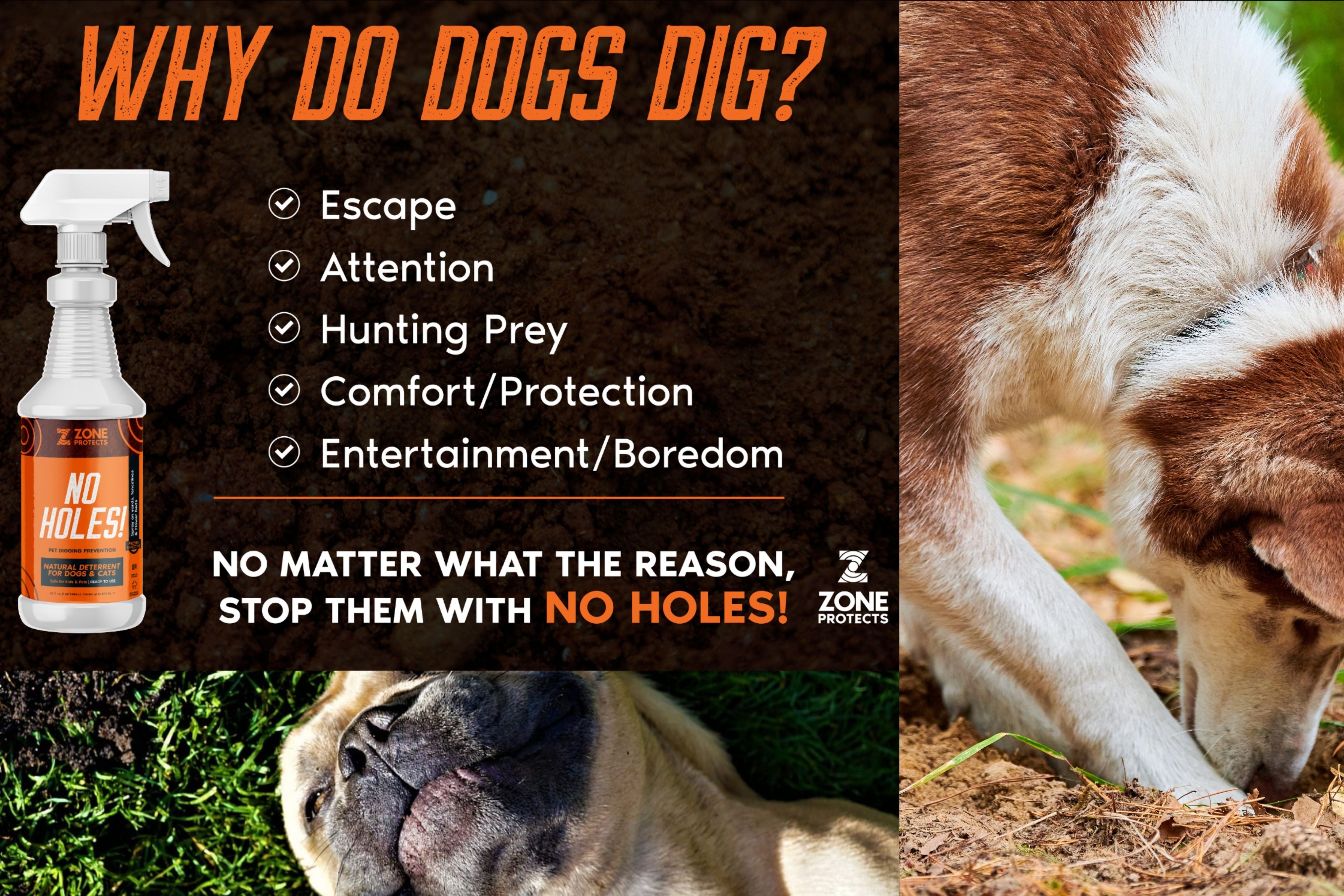 No Holes uses natural repellent oils such as garlic, peppermint and cinnamon. Dogs and cats dig for a number of reasons. No Holes makes them uncomfortable where they like to dig.